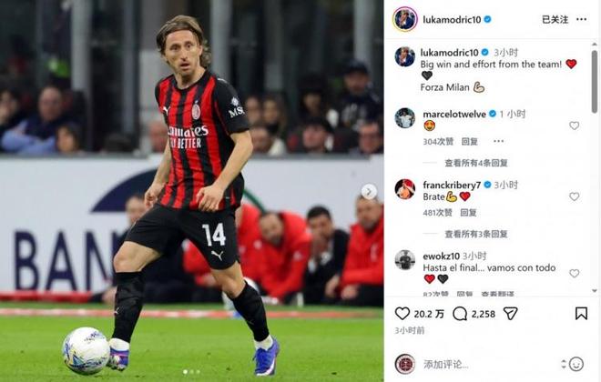 意甲第28輪米蘭德比,莫德裡奇踢滿全場,幫助AC米蘭1-0擊敗國際米蘭。賽後他在社交媒體曬出比賽照片,並配文寫道:“重要的勝利,全隊表現都很出色!加油米蘭!”這位40歲老將的領袖氣質和穩定發揮是球隊取勝的關鍵因素之一。