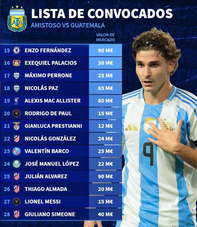 新一期阿根廷队身价榜:小蜘蛛、恩佐9000万欧第1,梅西1500万